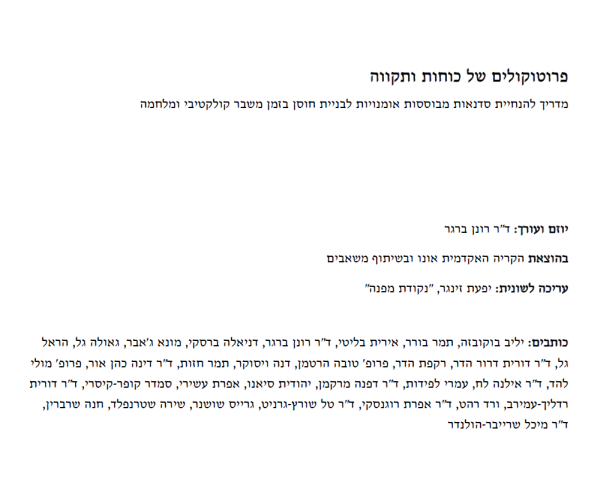 זהו ספר הפרוטוקולים הראשון בעולם בתחום הטיפול הקהילתי באומנויות במצבי משבר ומלחמה, אשר נכתב כל כולו על ידי מטפלים באומנויות ישראלים.