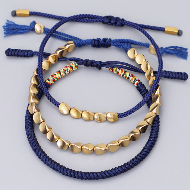 שלושה צמידים מחוט קלוע כחול שהם אחד, ניתנים לקיצור והארכה לענידה על היד או הרגל מעוטרים באבנים קטנות מוזהבות.