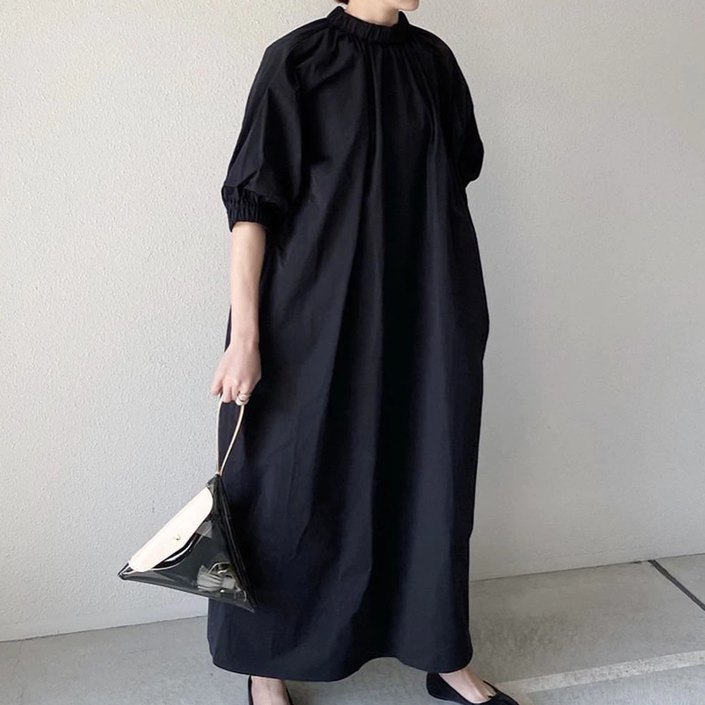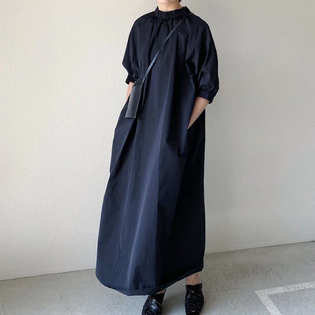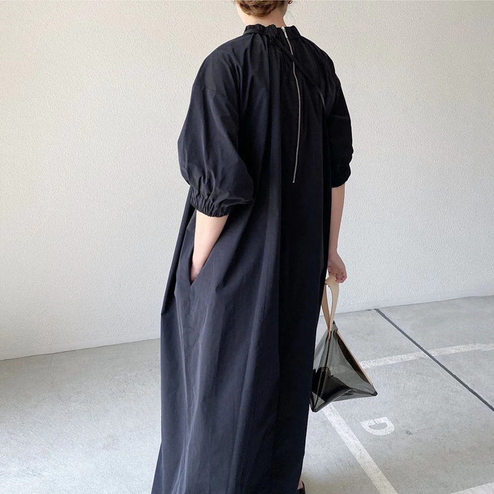 שמלה שחורה חלקה ארוכה מאד עם צאוורון סגור וריצ'רץ' מאחור. קפלים מסותתים המעניקים לה מראה שיקי וחלק.