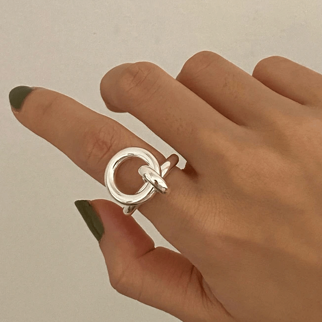 טבעת שהיא בתוך טבעת ובתוך טבעת היוצרת תכשיט ייחודי מוכסף