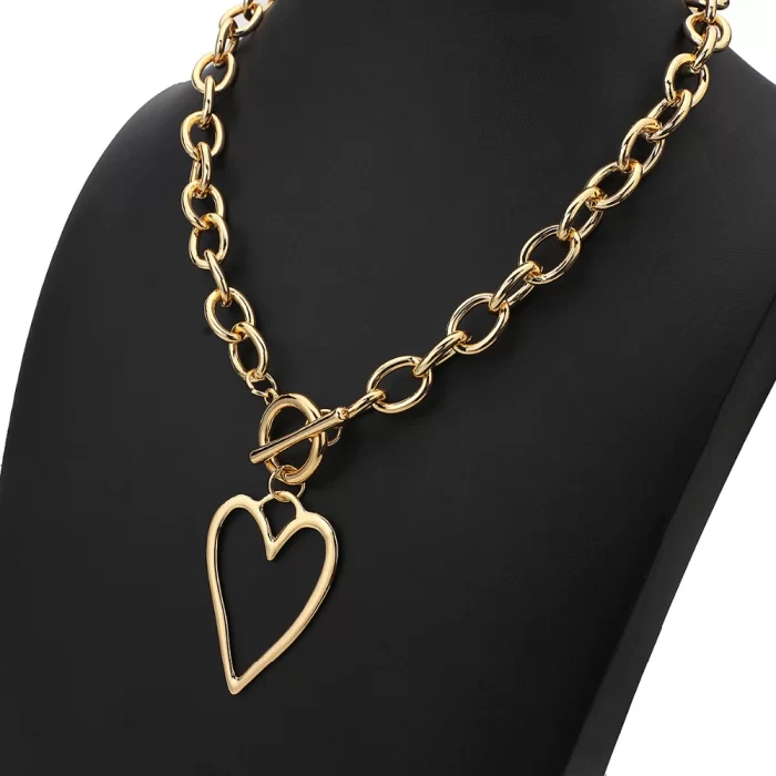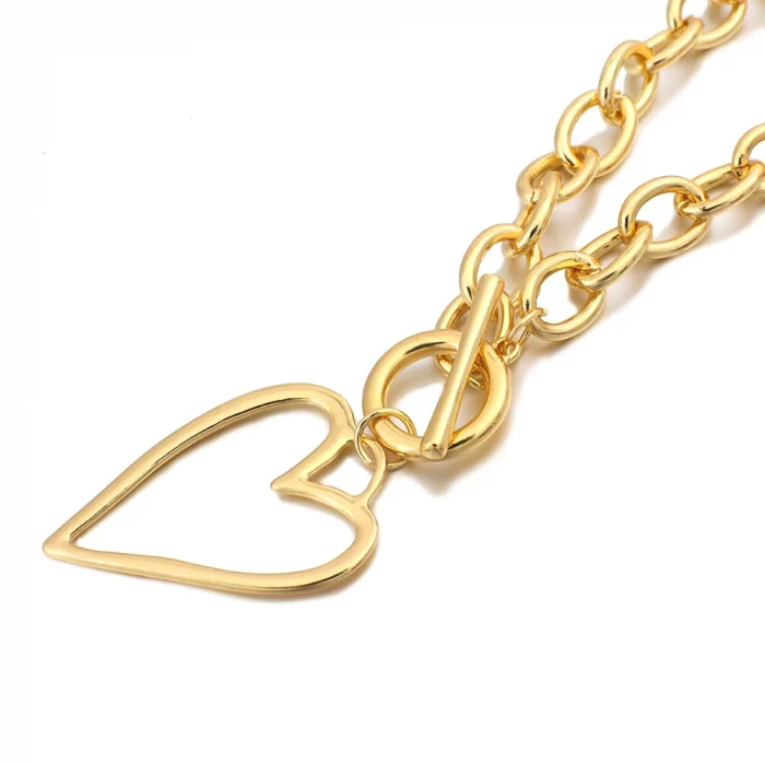 שרשרת חוליות מוזהבות גדולות עם תליון לב מוזהב. סוגר מוט ניצב בתוך טבעת מעוצב.