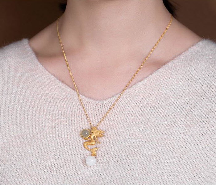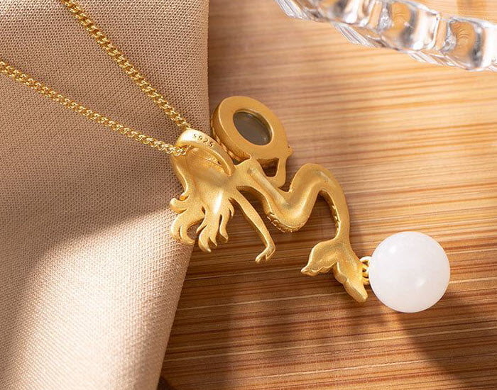 תליון בת הים מוזהב משובץ שתי אבני טורמלין טבעיות על שרשרת בצבע זהב עדינה.