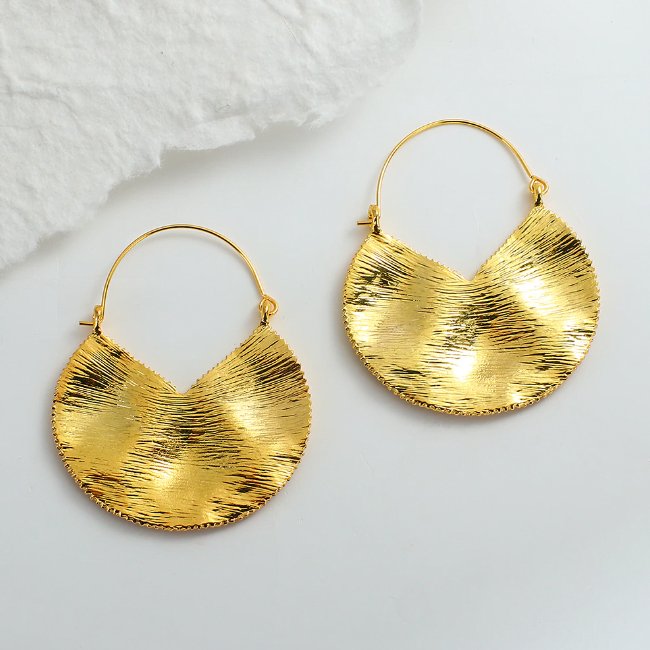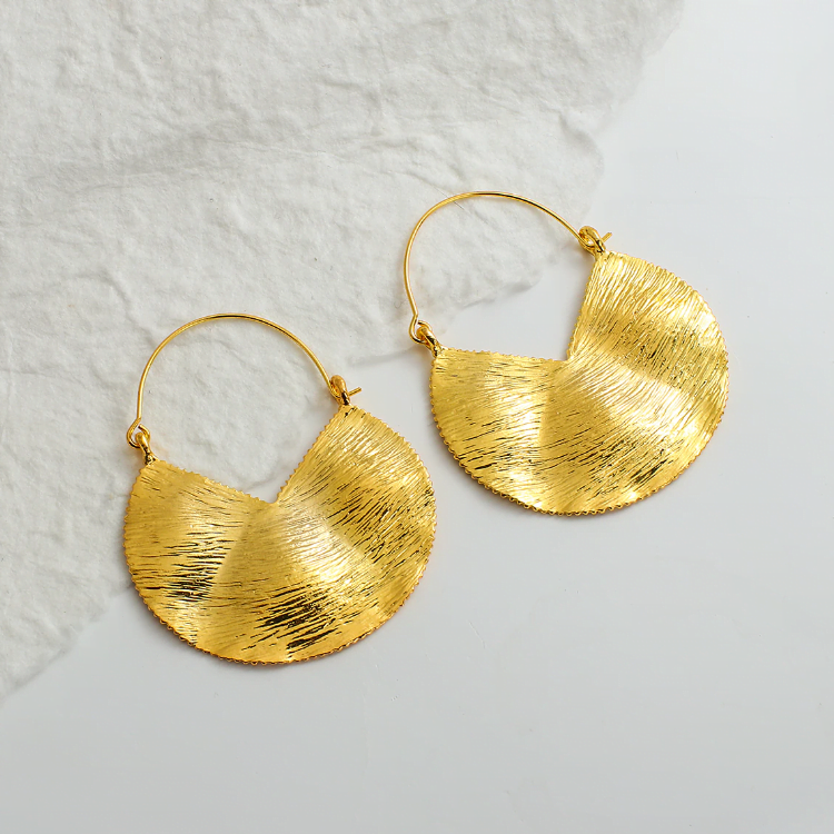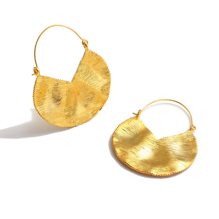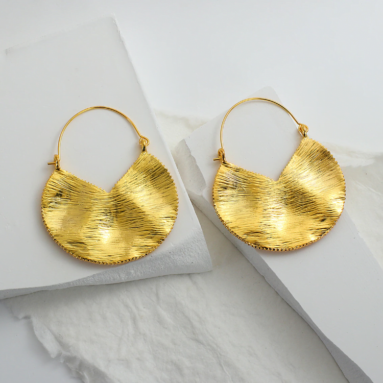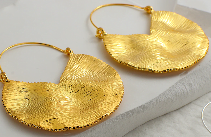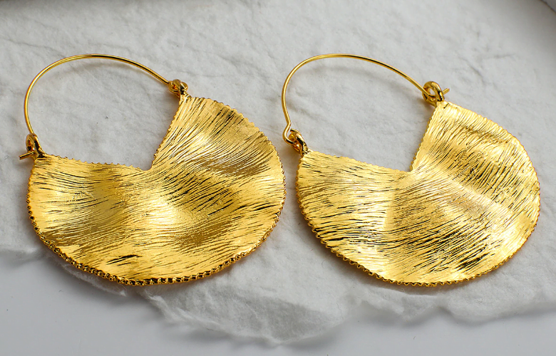 עגילי זהב תלויים על חישוק ותליון עיגול לא מושלם רקוע ומסותת כתכשיט היסטורי